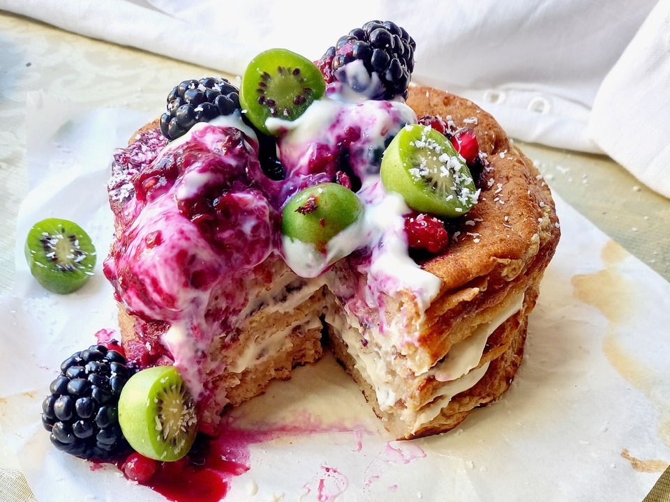 Wir stapeln die fertigen Pancakes immer zu einem Türmchen. Dazwischen geben wir etwas Joghurt. Garniert haben wir die Pancakes mit Brombeeren, Kiwibeeren und Kokosraspeln.